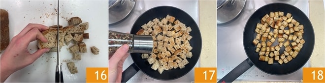 Enquanto isso, corte as fatias de pão em cubos 16. Transfira para a frigideira, adicione um fio de azeite, uma pitada de sal e pimenta 17. Junte um pouco de páprica também. Salteie na frigideira.