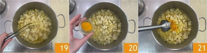 Quando os vegetais estiverem cozidos, elimine o alho e o alecrim 19. Adicione a cúrcuma 20 e bata tudo com um mixer de imersão 21.