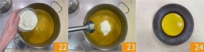 Uma vez obtida uma crema lisa, incorpore o iogurte 22 e bata novamente 23. Prato pronto 24.