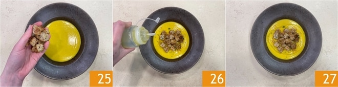 Finalize com os croutons crocantes 25, um fio de azeite 26, uma pitada de páprica e alecrim picado 27.
