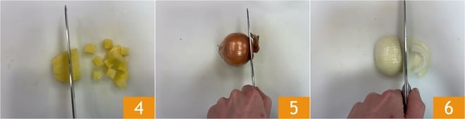 Corte-as em cubos 4 e passe para a cebola. Descasque-a 5 e fatie-a finamente 6.