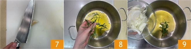 Esmague os dentes de alho com a lâmina da faca 7. Em uma panela grande, aqueça um fio de azeite em fogo médio. Adicione o alho, o alecrim 8 e a cebola 9.