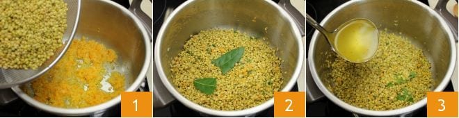 Para preparar a sopa cremosa de lentilhas folhada, deixe as lentilhas de molho com meia colher de chá de bicarbonato na noite anterior ou de 2 a 3 horas antes do uso, cuidando para trocar a água pelo menos uma vez. Depois, enxágue e escorra. Limpe e pique finamente a cebola, a cenoura e o aipo e deixe amolecer em fogo baixo por pelo menos 10 minutos no óleo e na manteiga. Adicione as lentilhas 1, mexa, adicione o louro 2, as folhas de tomilho fresco e cubra tudo com o caldo de legumes 3.