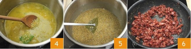 Cozinhe as lentilhas até ficarem macias, adicionando caldo quando necessário 4, depois salgue e apimente. Uma vez cozidas as lentilhas, retire a folha de louro 5. Enquanto as lentilhas cozinham, pegue o cotechino já cozido, esmigalhe na frigideira e deixe ficar crocante em fogo baixo, mexendo de vez em quando 6.