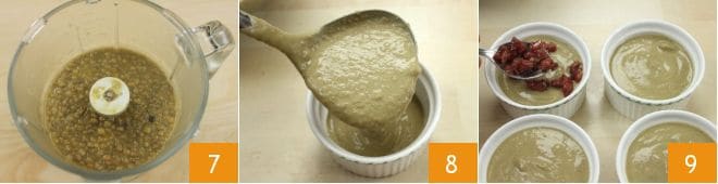 Uma vez cozidas, triture as lentilhas em um mixer até obter um creme fino 7. Se parecer muito denso, adicione um pouco de caldo de legumes. Derrame em 4 cocottes pequenas 8 e adicione em cada uma o cotechino esmigalhado 9.