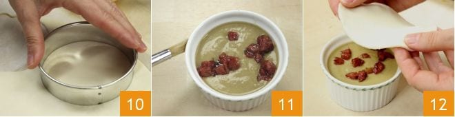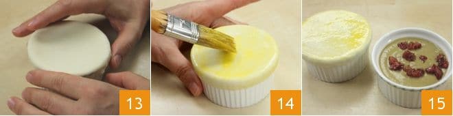 Corte com um cortador de biscoitos círculos de massa folhada com diâmetro de 1 cm mais largo que o das cocottes 10. Umedeça a borda das cocottes com água e cubra com o círculo de massa folhada 12,