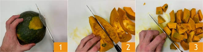 Para preparar a sopa cremosa de abóbora e queijo de cabra, primeiro remova a casca da abóbora 1 e elimine as sementes e filamentos internos. Corte-a primeiro em fatias 2 e depois em cubos 3.