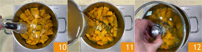 Ajuste o sal e a pimenta 10. Despeje o caldo de legumes na panela 11, leve à fervura e depois abaixe o fogo, cubra com uma tampa 12, e deixe cozinhar por 20 minutos ou até que a abóbora esteja macia.