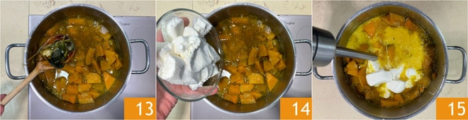 Desligue o fogo, remova o alecrim, a sálvia e o alho 13 e adicione 400 g de queijo de cabra 14. Bata com um liquidificador de imersão 15 até obter uma sopa cremosa lisa e homogênea.