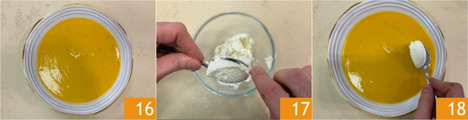 Sirva 16. Para cada prato, forme, com duas colheres de chá, 3 pequenas quenelles de queijo de cabra 17 e posicione-as sobre a sopa 18.