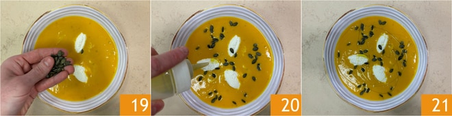 Complete com as sementes de abóbora torradas 19 e um fio de óleo 20. Sua sopa cremosa de abóbora e queijo de cabra está pronta para ser servida 21.