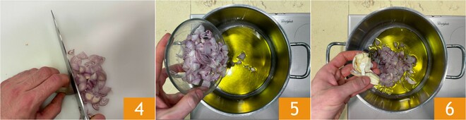Corte a cebola em fatias finas 4. Em uma panela, aqueça o óleo, adicione a cebola 5 e o alho amassado com casca 6.