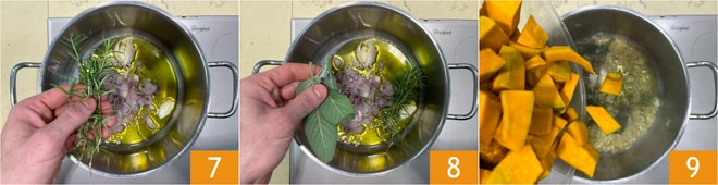 Adicione o alecrim 7, a sálvia 8 e deixe refogar por 2 minutos. Acrescente a abóbora 9 e cozinhe por 5-7 minutos, em fogo alto, mexendo sempre.
