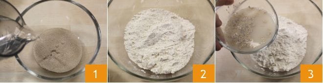 Para preparar as venezianas com creme, comece fazendo o pré-fermento: dissolva o fermento biológico seco (ou fresco) na água morna 1. Em uma tigela, misture a farinha 00 e a farinha manitoba 2 e despeje dentro o fermento dissolvido 3.