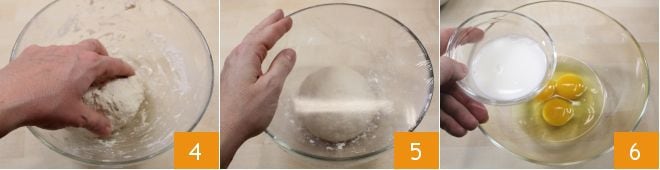 Sove à mão 4 para obter uma massa macia e homogênea 4 que você colocará em uma tigela coberta com filme plástico 5 e deixará fermentar por cerca de duas horas à temperatura ambiente. Enquanto isso, prepare os ingredientes para a massa principal: coloque os ovos em uma tigela junto com o leite 6,