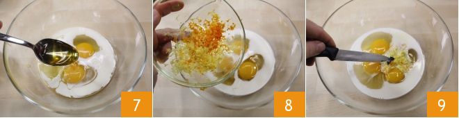o mel 7, as raspas de laranja e limão 8 e as sementes de meia fava de baunilha 9. Bata bem tudo com um garfo.