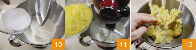 Na tigela de uma batedeira (ou em uma tigela grande se amassar à mão), coloque as farinhas e o açúcar granulado 10 e, enquanto a batedeira está em ação, despeje aos poucos a mistura de ovos 11. A massa deve estar bem misturada e macia 12. Se estiver usando a batedeira, substitua a pá pela gancho.