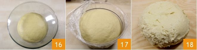 A essa altura, o pré-fermento deve ter dobrado de volume 13, junte-o à massa principal na tigela e ligue a batedeira para misturar bem os dois compostos 14. Por último, adicione a manteiga amolecida à temperatura ambiente, misturada com o sal, um pedacinho de cada vez enquanto a batedeira (velocidade 2) está em ação, não adicionando outro até que o anterior esteja incorporado 15. Para obter uma massa lisa, macia e compacta, leva cerca de 25 minutos com a batedeira e um pouco mais se amassar à mão. Uma vez que toda a manteiga foi incorporada, para soltar a massa das paredes da batedeira, coloque alguns pitacos de farinha ao longo do perímetro da tigela até que esteja enrolada em torno do gancho. Despeje a massa em uma superfície enfarinhada e trabalhe rapidamente para dar uma forma esférica.