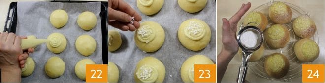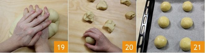 trabalhe-a com as mãos para desinflá-la e torná-la mais macia 19. Forme um rolo que você dividirá em 12 partes (de cerca de 80 g cada, mas você também pode fazer menores). Trabalhe cada pedaço para formar bolinhas lisas 20 que você colocará em uma assadeira forrada com papel manteiga espaçadas uma da outra. Pincele cada bolinha com a gema batida com um par de colheres de sopa de creme de leite ou leite e deixe fermentar em forno desligado com a luz acesa até dobrar de volume, cerca de 2-3 horas.