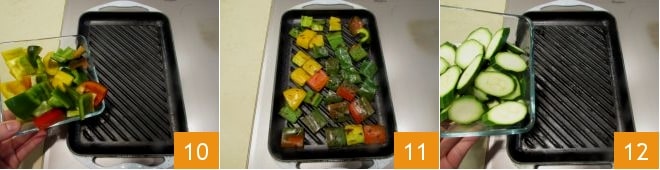 Quando a grelha estiver bem quente, cozinhe os legumes pouco a pouco: distribua os pimentões um ao lado do outro 10, grelhando-os por 5 minutos e virando-os com uma pinça de cozinha para uma cozedura uniforme 11, depois coloque no fogo as abobrinhas 12