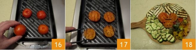 Por fim, termine com os tomates, cozinhando-os por 4 minutos até que estejam bem grelhados (16-17). Finalmente, você pode servir seus legumes grelhados, temperando com azeite de oliva, sal e pimenta 18.