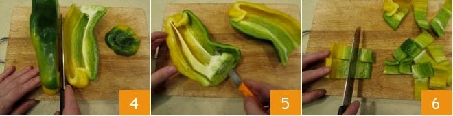 pegue os pimentões, elimine a parte superior, divida-os ao meio 4, depois com uma faca retire os filamentos brancos e as sementes que estão dentro 5. Corte-os em fatias, depois em cubos grandes e reserve 6.