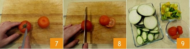 Retire o pedúnculo dos tomates 7 e corte-os em rodelas também de 4-5 mm 8. Uma vez cortados todos os legumes 9, coloque uma grelha para aquecer no fogo.