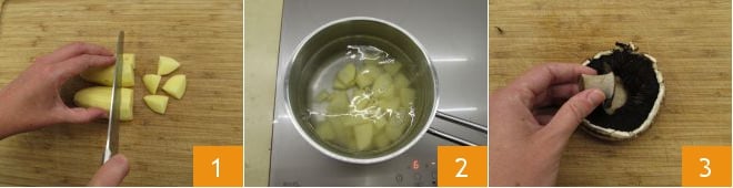 Para preparar os legumes em crosta, comece descascando e cortando em pedaços grandes de 2-3 cm as batatas 1, mergulhe-as em uma panela com água salgada e fervente e cozinhe por 15 minutos 2; uma vez prontas, escorra e deixe esfriar. Enquanto isso, limpe os cogumelos com um pano ou um papel ligeiramente umedecido e depois separe o caule do chapéu 3.