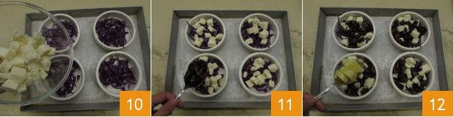 Distribua o repolho no fundo de 4 cocottes e adicione um pouco de cubos de taleggio 10, um pouco de cogumelos 11 e batatas 12.