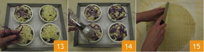 Finalize com o queijo fontina ralado e alguns tufos de repolho 13, por fim, uma bela pitada de pimenta 14. Desenrole os dois rolos de massa folhada e corte em losangos de cerca de 1 cm 15.