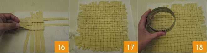 Então, comece a entrelaçar os losangos entre si 16 até formar um padrão semelhante ao de uma cesta de vime 17. Uma vez obtido um quadrado denso, corte 4 círculos com um cortador de 11 cm 18.
