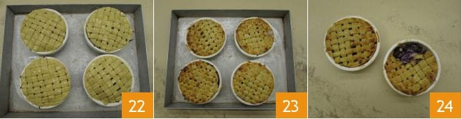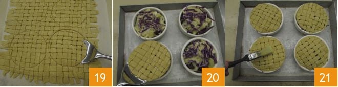 Levante os discos com a ajuda de uma espátula 19 e coloque sobre as cocottes, pressionando levemente para aderir a massa 20. Pincele a superfície com uma mistura de ovo batido com uma colher de leite 21