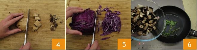 Pique tanto os caules quanto os chapéus 4. Depois de retirar as primeiras folhas do repolho roxo, fatie finamente 5. Em uma panela, aqueça um pouco de azeite junto com um dente de alho com casca, um ramo de alecrim e algumas folhas de sálvia. Em seguida, mergulhe os pedaços de cogumelo 6.