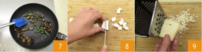 Depois, ajuste o sal, espere um momento para que os sucos se retirem e reserve 7. Cuide dos queijos. Retire a crosta do taleggio e corte em cubos 8, enquanto o queijo fontina pode ser ralado em um ralador de furos largos 9.