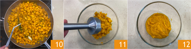 Neste ponto, a abóbora já estará amolecida, então retire o alho e o tomilho 10. Transfira a abóbora para um copo 11 e bata com um mixer de imersão até obter um creme liso e homogêneo 12.