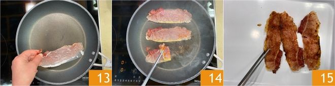 Reserve e passe ao speck: aqueça bem uma frigideira antiaderente, depois coloque as fatias de speck 13 e doure em fogo médio-alto de ambos os lados por cerca de 3-4 minutos 14. Quando estiverem crocantes e douradas, retire-as da frigideira e reserve 15.