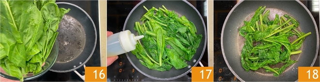 Coloque as ervas na mesma frigideira 16, tempere com óleo 17, sal e pimenta e cozinhe em fogo médio-baixo por cerca de 3-4 minutos. Uma vez murchas 18, reserve as ervas.
