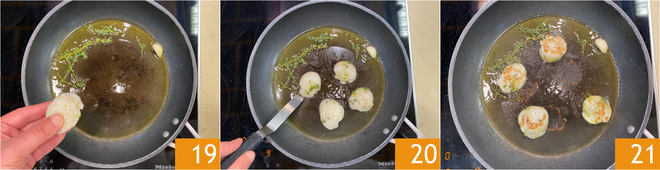 Por último, cozinhe as vieiras: na frigideira, aqueça por um minuto o óleo com o alho e o tomilho, depois coloque as vieiras 19 e doure em fogo alto de ambos os lados 20 por um total de 2-3 minutos 21.