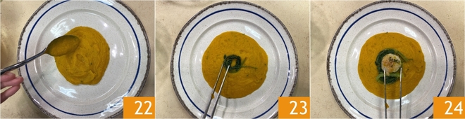 Você está pronto para empratar: distribua o creme de abóbora na base do prato 22, forme um ninho de ervas no centro 23 e coloque uma vieira por cima 24.
