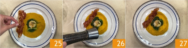 Complete com uma fatia de speck crocante 25 e uma pitada de pimenta 26. Suas vieiras sobre creme de abóbora com ervas e speck estão prontas para serem servidas 27!