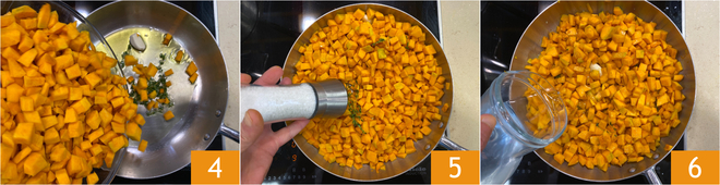 Adicione a abóbora 4, sal 5 e pimenta. Cubra com cerca de 200-300 g de água 6 e cozinhe em fogo médio-alto por cerca de 15 minutos.