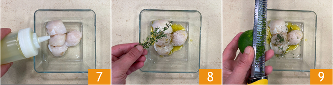 Enquanto isso, tempere as vieiras com óleo 7, sal, pimenta, tomilho 8 e casca de limão siciliano ralada 9. Misture delicadamente e deixe marinar na geladeira enquanto continua com a receita.
