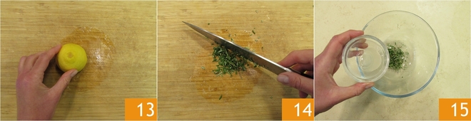 Prepare o molho. Para não escurecer o alecrim, umedeça a tábua de corte com suco de limão 13, depois pique finamente as folhas 14 e transfira para uma tigela. Adicione também 3 g de suco de limão 15.