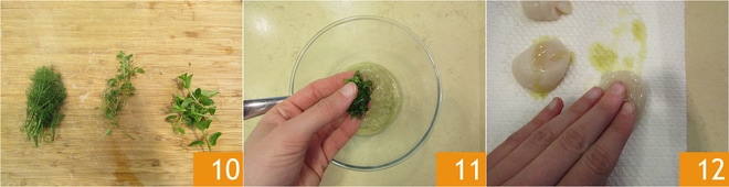 Pique as ervas aromáticas (manjerona, erva-doce e hortelã) 10, reserve algumas folhas de manjerona inteiras. Quando o creme de alcachofras e batatas estiver morno, adicione as ervas picadas 11 e mexa bem, se necessário ajuste o sal e a pimenta. Por último, cuide das vieiras: lave e seque-as bem, unte-as cuidadosamente com azeite de oliva extra virgem 12.