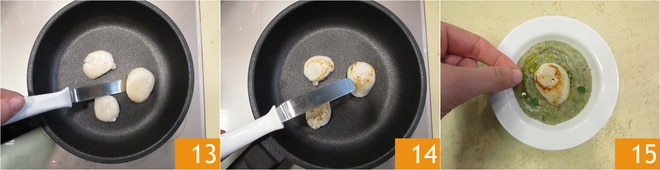 Aqueça bem uma frigideira antiaderente, a base deve estar quente: sele dos dois lados as vieiras em fogo alto 13 14, em poucos instantes as vieiras dourarão. Monte o prato: coloque duas colheres de creme de alcachofra em cada prato, coloque uma vieira no centro, adicione algumas gotas de óleo de pimenta. Tempere com uma pitada de mix de pimenta moída na hora, duas folhas de manjerona 15 e alguns flocos de sal sobre a vieira.