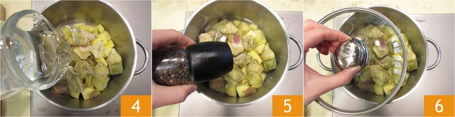 Adicione 250 g de água 4, sal e pimenta a gosto 5, depois cozinhe por cerca de 20 minutos em fogo médio-alto, com tampa 6.