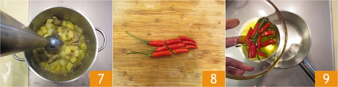 Quando estiver pronto, você pode bater tudo com um mixer de imersão 7 até obter um creme homogêneo. Enquanto isso, prepare o óleo picante: corte os pimentões frescos em 3 partes 8, coloque-os em uma panela com 20 g de azeite de oliva extra virgem 9. Deixe apurar em fogo baixíssimo por cerca de 7 minutos, depois desligue o fogo e reserve.