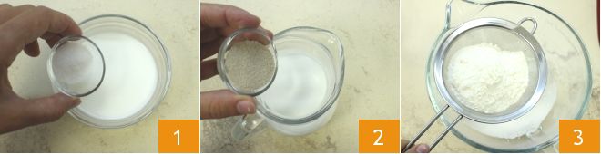 Para preparar a viennoise au chocolat, comece dissolvendo o sal em 200 ml de leite morno 1, na parte restante do leite dissolva o fermento biológico seco (alternativamente, você pode usar 12 g de fermento biológico fresco) 2 e reserve. Enquanto isso, na tigela de uma batedeira, peneire a farinha 3 e