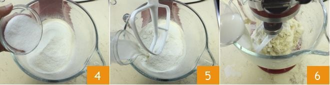 adicione o açúcar refinado 4. Comece a misturar usando a pá e adicionando aos poucos o leite com o fermento 5, ligue a batedeira para amalgamar a mistura, depois adicione o leite no qual você dissolveu o sal 6.