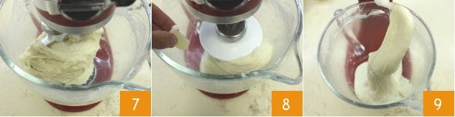 Quando os ingredientes estiverem bem misturados 7, substitua a pá pelo gancho e adicione a manteiga amolecida em pedaços, um cubo de cada vez 8. Quando você tiver adicionado toda a manteiga, amasse por mais 20 minutos até que a massa se solte das laterais e fique muito elástica e lisa 9.